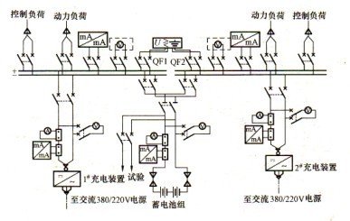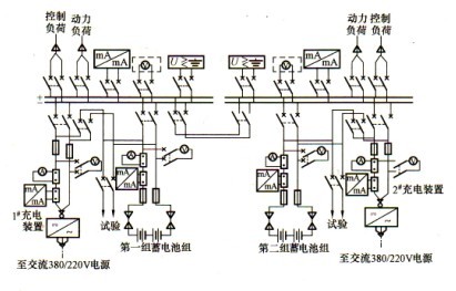 (3)方案三:單母線分段(一組蓄電池,兩套充電裝置)接線,見圖2-3。特點(diǎn):接線可靠、靈活,一組蓄電池經(jīng)兩個(gè)空氣斷路器分別接到兩段母線上。兩套相同容量的充電裝置接在不同