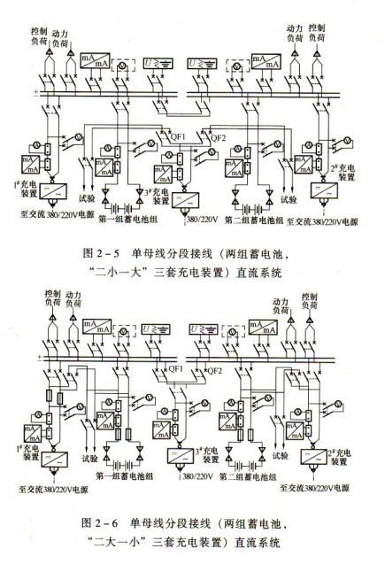 (4)方案四:單母線分段(兩組蓄電池,兩套充電裝置)接線,見圖2-4。特點(diǎn):接線可靠、靈活,每段母線各設(shè)一組蓄電池和一套充電裝置,分段開關(guān)正常斷開,兩段母線分列運(yùn)行。因重要負(fù)荷由兩段母線分別供電,保證任一段母線停運(yùn)均不會(huì)使