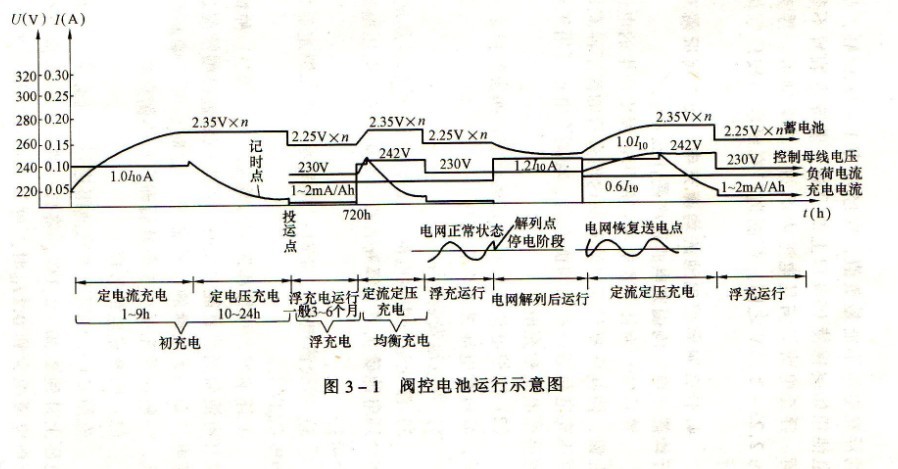閥控電池組完成初充電后,即可轉(zhuǎn)為浮充電方式運行。對于變(配)電所只有一組蓄電池時,浮充電就是充電裝置首先應(yīng)滿足直流負(fù)荷的要求,另外還要以小電流滿足電內(nèi)部的自放電要求。所以浮充電電流值等于直流負(fù)荷電流+浮充電流。浮充電補(bǔ)償電池內(nèi)部的自放電和外殼表面臟污后所產(chǎn)生的爬電損失。除直流負(fù)荷電流外,真正充進(jìn)電池內(nèi)